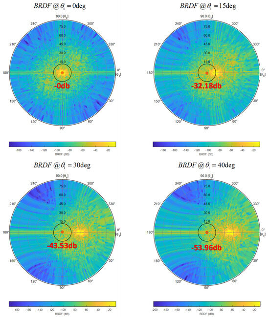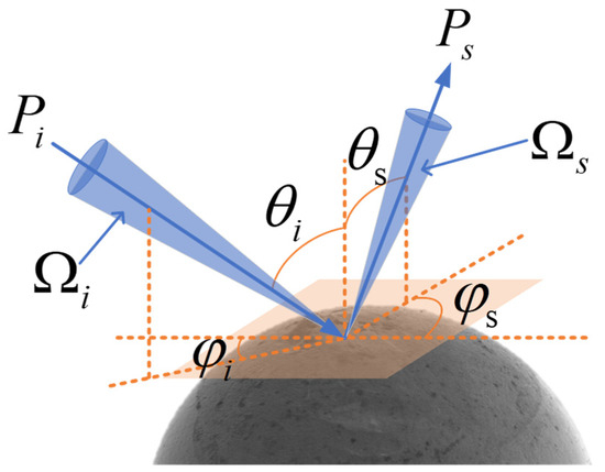 First, the intensity distribution of the scattered light field is described by the bidirectional reflective distribution function (BRDF). As shown in Figure 5, the BRDF is related to , , , and . In the spherical coordinate system, the unit solid angle is , and denote the polar angle and azimuthal angle, respectively, and the subscripts i and s denote the incident and scattered light, respectively. The BRDF is defined as the ratio of the radiance of the scattered light emitted from the unit solid angle at an arbitrary spatial angle , to the irradiance received per unit area at an arbitrary spatial angle :