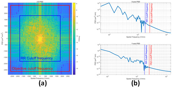It is worth noting that the PSD data, in practice, is an approximation limited by bandwidth [24]. This limitation arises because 2D profile data, generated from a white-light interferometer, consists of samples with a finite number and interval. By substituting the profile data in Figure 1 into Equations (6) and (7), the PSD of the Cu pillar is determined, as shown in Figure 6. The blue box represents the bandwidth required by Rayleigh–Rice scattering theory under first-order approximation [22], and the red box denotes the instrumental bandwidth of the white-light interferometer [24]. The bandwidth of the profilometer adequately meets the requirements of Rayleigh–Rice scattering theory, which is crucial for accurate BRDF calculations.