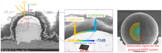 According to the BRDF, when the angle of incidence is 40°, the intensity of scattered light at the top of the Cu pillar attenuates by approximately −50 dB compared to the intensity of specularly reflected light. Due to the fact that CMOS typically has a dynamic range of 70 dB, it theoretically detects the scattered signal from the position corresponding to specular reflection up to the top of the Cu pillar, as shown in Figure 8.