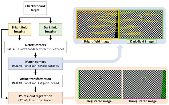 The height maps from the bright-field and dark-field imaging channels need registration for Cu pillar height evaluation. The telecentric optical system’s telecentricity and low aberration allow the use of a checkerboard target for point cloud registration. In this study, the control point-based image registration method [27] is used. Figure 9 illustrates the registration process using MATLAB(2023b)’s built-in library functions.