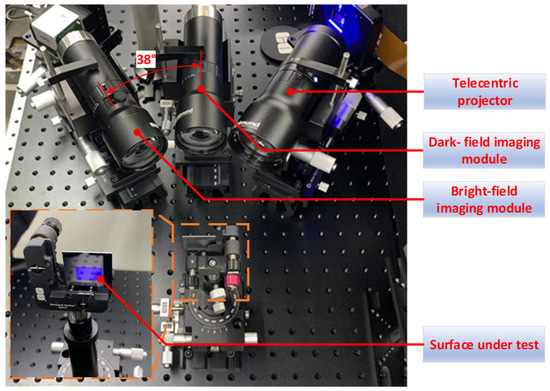 Figure 10 shows the experimental setup for the proposed MFPP concept. The projector comprises a digital micromirror device (DMD, Texas Instruments, Dallas, TX, USA, DLP670s) and a telecentric lens (Edmund, 62#902, Shanghai, China). The bright-field imaging module includes an industrial camera (IDS, U3-3800SE-M-GL, Obersulm, Germany) and a telecentric lens (Edmund, 15#873, Shanghai, China). The dark-field imaging module shares identical components with the bright-field module. The optical axes of the bright field view are inclined at a 38° angle relative to the normal direction of the test surface. The light source used was a low-coherence LED with a central wavelength of 465 nm. To mitigate higher-order harmonics from the discrete pixel of the DMD, the telecentric lens in the projector is set to a f-number of 12. Additionally, to maximize the effective FOV of the MFPP system, the DMD and the CMOS in the bright-field module meet the Scheimpflug condition. Further, the focal planes of the bright-field and dark-field modules are precisely aligned using a method enabling visualization of their position and orientation [28].