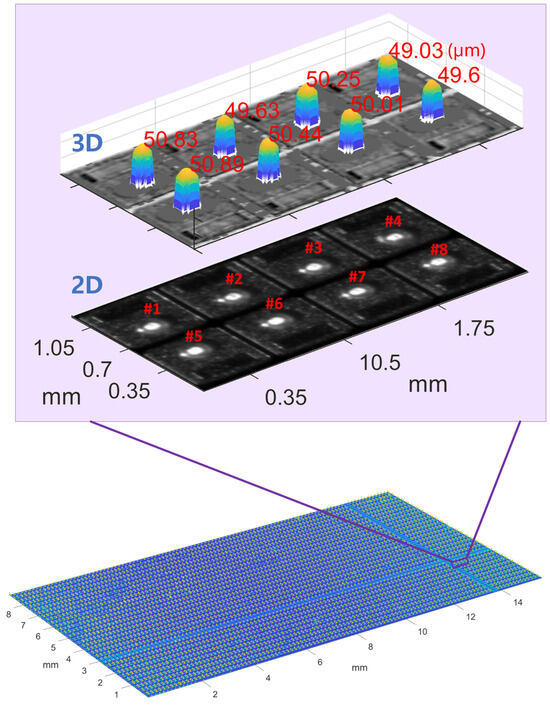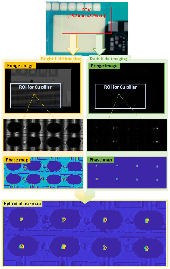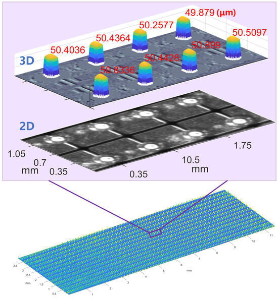 Figure 13 shows the 3D reconstruction of wafer-2. The reconstructed area covers 15.2 mm × 8.9 mm, defining the effective FOV of the proposed MFPP system. Note that the effective FOV is slightly smaller than the imaging module’s maximum FOV, as the DLP’s fringe pattern does not fully cover the FOV of the telecentric lens.