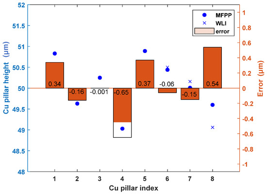 To evaluate measurement errors, we used a white-light interferometer (SENSOFAR, Barcelona, Spain, S-neox, 20× objective) to measure the sub-panel region in Figure 13. Figure 14 shows the white-light interferometer measurements annotated with Cu pillar heights. Figure 15 shows the measurement errors for each Cu pillar. The maximum error is 0.65 μm, with an average error of 0.0286 μm. Measurement errors may stem from differences in spatial resolution between the proposed MFPP system and the white-light interferometer. Small scratches on Cu pillar surfaces may prevent the MFPP system, with its strong spatial filtering effect, from accurately measuring their heights. In fact, spatial resolutions vary among profilometers, resulting in deviations in profile measurement results. Further investigation is needed to figure out the impact of the proposed MFPP system’s spatial resolution on measurement results.