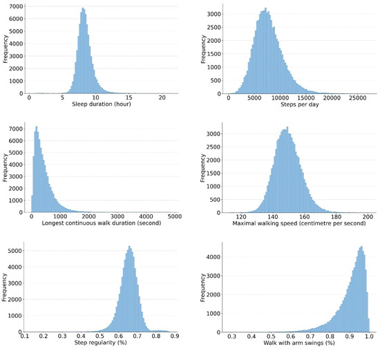 Histograms illustrating the distribution of selected sleep, gait quantity, distribution, speed quality, and hand position biomarkers.