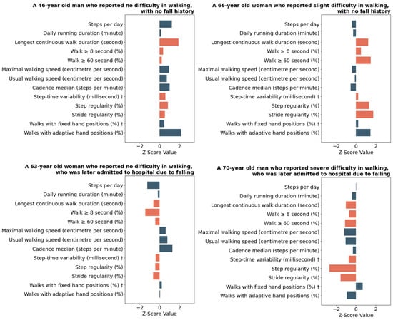 Digital Gait Biomarker (DGB) z-score output for four participants. Test scores represent standardised (z) scores, reference to the total sample (n = 73,438), to allow direct comparison in performance between participants. Each unit signifies one standard deviation. A score of zero reflects average performance relative to the study population, whereas positive and negative scores indicate performances that are above and below average, respectively. † indicates the direction of the digital gait biomarker is reversed, so that a positive score always indicates a better performance. Colour differences distinguish biomarker domains.