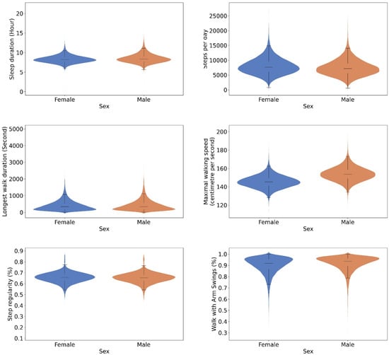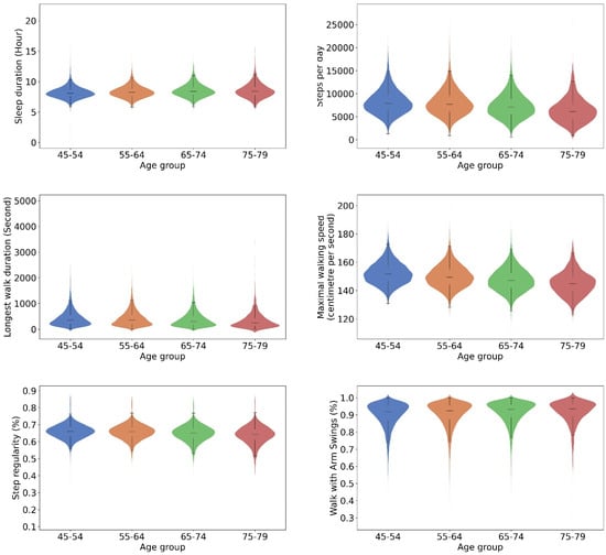 Selected biomarkers represent their respective domains: steps per day (gait quantity), duration of the longest continuous walk (walk length distribution), maximal walking speed (gait speed and intensity), step regularity (gait quality), the proportion of walking with arm swings (walk hand positions), and sleep duration (Sleep). To evaluate sex differences in parametric measures, we used independent t-tests, and for non-parametric measures, Mann–Whitney U tests were applied. We also explored differences across age groups—45–54, 55–64, 65–74, and 75–79 years—using one-way analysis of variance (ANOVA) for parametric measures and Kruskal–Wallis tests for non-parametric measures. The visual representation of distribution differences was conducted with violin plots.
