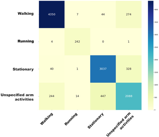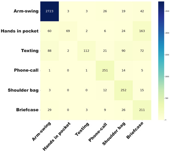We referenced the video recordings for the synchronization and annotation of the accelerometric signals and ground-truth electronic walkway measurements, including walking speed and step time. We derived the sample level Euclidean norm from the annotated accelerometric signals and filtered it with a Butterworth bandpass filter (5th order, 0.25 Hz low cutoff frequency, 2.5 Hz high cutoff frequency, and 100 Hz sampling frequency). The filtered signals were then segmented into non-overlapping 4-second windows. Fifty-four features were extracted for training and validating a two-stage multiclass support vector machine (SVM) classification model with ten fold validation at the participant level. In the first stage, the 4-second window was first classified into “walks with arm swing”, “other complex walking”, “running”, “stationary”, “unspecified arms activities while sitting/standing”, or “unspecified arms activities while walking”, with the class weights set to [50, 25, 10, 5, 5, 5] to primarily focus on walking. The second stage further classified windows in the “other complex walking” into one of the following: “walking with hands in pocket”, “walking with hands held stationary”, “walking with hand held next to the ear”, “walking with hand resting on the shoulder”, and “ walking with a briefcase/grocery bag”. The SVM model was configured with a Radial Basis Function (RBF) kernel, with a kernel coefficient, gamma, of 1/54.