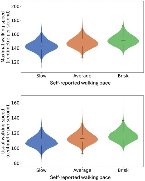Maximal and usual walking speed for people who reported slow (n = 3431), steady (n = 35,319) and brisk (n = 34,483) walking paces. N = 73,233. Widths of the violine plots, kernel densities; top and bottom of the violine plots, 1st and 99th percentiles; top and bottom of the box, upper and lower quartiles; line inside of the box, median; and caps of the whisker, the highest and lowest values within 1.5 times the IQR from the upper and lower quartiles, respectively.