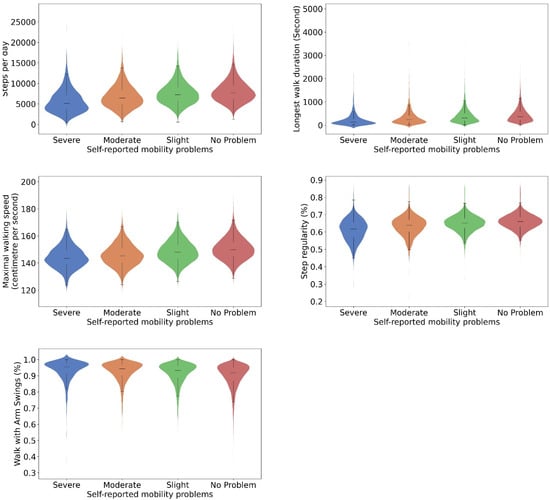 Digital gait biomarkers for people who reported severe (n = 1053), moderate (n = 3572) and slight (n = 9533) and no problems (n = 37,634) with walking. N = 51,792. Widths of the violine plots, kernel densities; top and bottom of the violine plots, 1st and 99th percentiles; top and bottom of the box, upper and lower quartiles; line inside of the box, median; and caps of the whisker, the highest and lowest values within 1.5 times the IQR from the upper and lower quartiles, respectively.