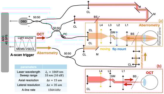 A change of SD-OCT to SS-OCT may help with SNR roll-off to extend the imaging depth as well as the imaging speed. However, the typical wavelength of swept source lasers is around 1 µm, which is disadvantageous for the mostly silica-based area detectors used in Hartmann–Shack sensors. Their use of a shared wavelength beam requires additional modification of beam geometry; a large retinal spot size of 280–375 µm makes it difficult to determine the centroid in the Hartmann–Shack aberrometer, requiring large pitch size, which leads to a trade-off between sensitivity and dynamic range. In our system, we share the same swept source laser centered at 1069 nm between OCT and DWA with reduced power. In DWA, a diffraction-limited stationary spot of 67 µm is formed at the retina by a narrow illumination beam. The reflected light then passes through the full pupil of the eye, capturing the single-path optical aberrations. Therefore, our aberration analysis is theoretically tolerant to the cancellation of odd aberrations thanks to the second pass through the optics [