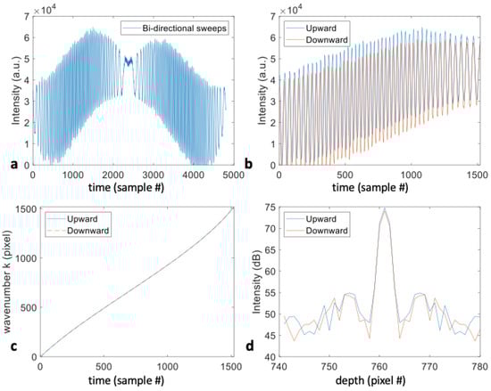 21]. By utilizing the bidirectional sweeps rather than discarding the downward sweep, volumetric image data covering the full anterior chamber can be acquired down to the posterior lens and recorded at a full sweep rate of 1.6 MHz. This MHz-speed imaging contributes to improved anterior imaging with low motion distortions compared to typical clinical SS-OCT at the speed of hundreds of kHz A-line rate and is potentially clinically advantageous in terms of patient comfort and improved diagnostics. The advantage of full-speed exploration by averaging the two independent sweeps improves the SNR in imaging and further suppresses the phase fluctuation in wavefront measurement.