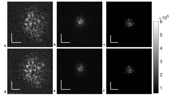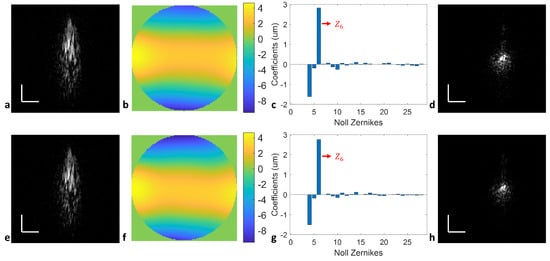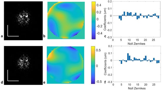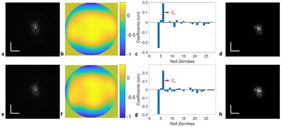 Figure 4b,e indicate that the predominating defocus error has been eliminated. Using the upward and downward sweeps independently results in similar residual aberrations, described by the root mean square wavefront error (RMSWFE) as 0.1643 µm and 0.1711 µm, respectively. Both values are well below the Rayleigh criterion, as seen in the bar plots of Zernike coefficients (