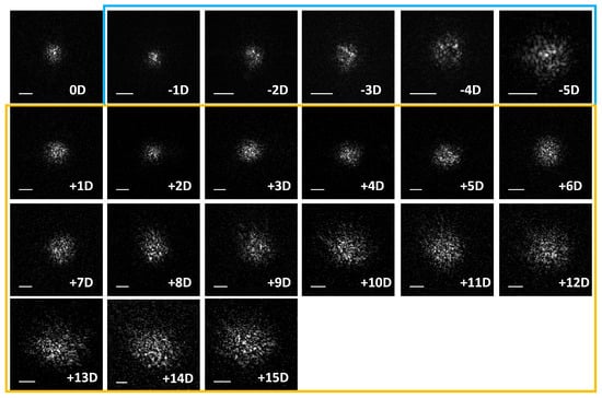 Volumetric PSFs were acquired at a 4–5 mm pupil diameter of the model eye for the range of −5 D to +15 D defocus, with the defocus error precompensated. Selected en face PSFs for upward sweep images are shown here with the pupil plane aspect ratio corrected for each diopter case other than 0 D. The details of correction are provided in