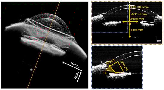 In the OCT anterior segment imaging mode, a 16 mm × 16 mm × 7 mm volume of the anterior chamber of a model eye with known dimensions is acquired at an A-scan rate of 1.6 MHz. Different layers and structures of the anterior segment, such as the anterior cornea, posterior cornea, iris, anterior lens, and posterior lens, can be clearly visualized in the reconstructed volume and B-scan OCT images with a wide field of view in