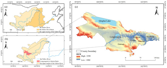Location of the Longyangxia to Lijiaxia Basin. (a) Location of the YRB and the upper reaches of the Yellow River. (b) Location of the upper reaches of the Yellow River and the Longyangxia to Lijiaxia Basin. (c) Regional map of the Longyangxia to Lijiaxia Basin.