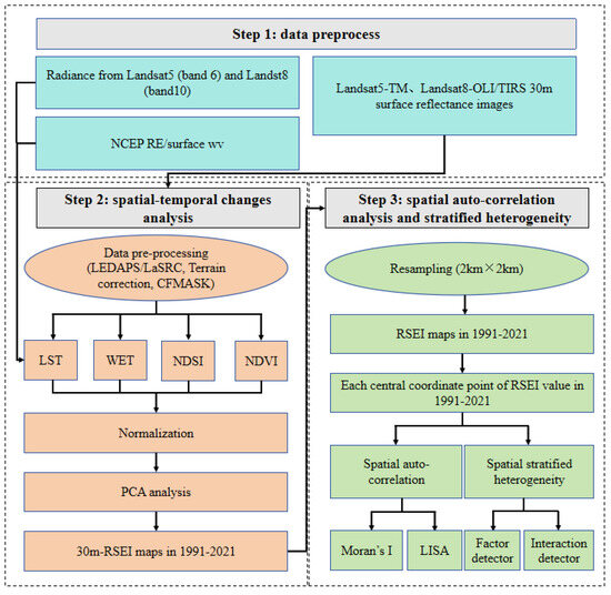 A detailed workflow was established for this study (Figure 2). First, we produced seven 30 m RSEI maps for 1991, 1996, 2001, 2006, 2011, 2016, and 2021 using Landsat 5 TM and 8 OLI/TIRS images based on the GEE platform. Second, based on the seven RSEI maps from 1991–2021, the spatiotemporal characteristics of EEQ in the Longyangxia to Lijiaxia Basin were analyzed. The spatial correlation of the EEQ was analyzed using Moran’s I (global spatial autocorrelation) and the Local Indicators of Spatial Association (LISA) indices. Finally, the effects of individual factors and their interactions on EEQ were explored using GeoDetector.