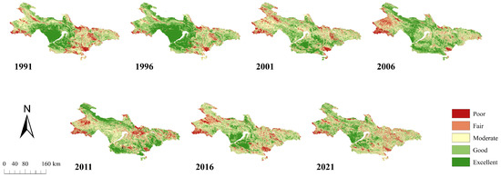 Subsequent analysis revealed a discernible temporal trend in the mean RSEI values in the region, indicating it fluctuates from decreasing–increasing–decreasing in 1991–2021. Noteworthy improvements were observed between 2001 and 2006. By employing a series of seven RSEI maps at 5-year intervals spanning 1991 to 2021, comprehensive calculations were undertaken to determine the extent and proportionality of each ecological classification, encompassing the categories of poor, fair, moderate, good, and excellent. Figure 4 illustrates the proportional changes for each ecological grade. From 1991 to 2001, there was a reduction in the overall proportion of ecological grades categorized as poor, fair, and moderate, juxtaposed with a concurrent increase in the proportion of grades classified as good or excellent. Between 2001 and 2011, the proportion of poor or excellent ecological ratings decreased, whereas the proportion of moderate to good ratings increased. However, from 2011 to 2021, the ecological ratings of good and excellent increased again. In summary, the EEQ within the basin spanning from Longyangxia to Lijiaxia exhibited a progression characterized by amelioration from 1991 to 2001, followed by regression from 2001 to 2011, and a resurgence from 2011 to 2021.