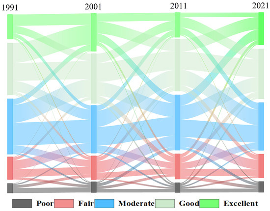 Sankey diagram of EEQ levels for the Longyangxia to Lijiaxia Basin from 1991 to 2021.