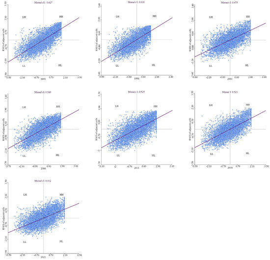 Moran scatter plots of the RSEI in the Longyangxia to Lijiaxia Basin in 1991, 1996, 2001, 2006, 2011, 2016, and 2021.