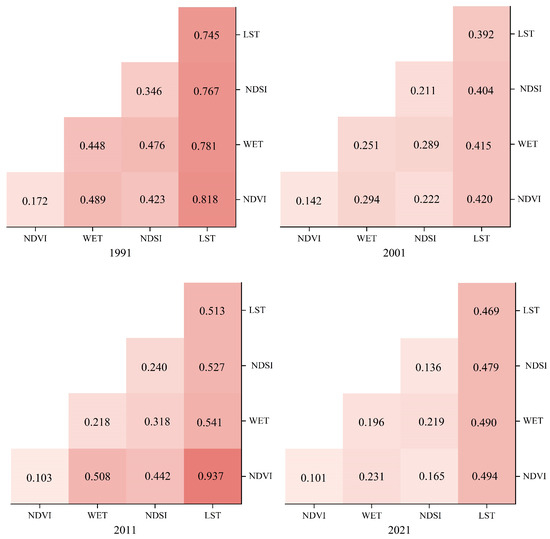 Factor detection of four indicators in 1991, 2001, 2011, and 2021.