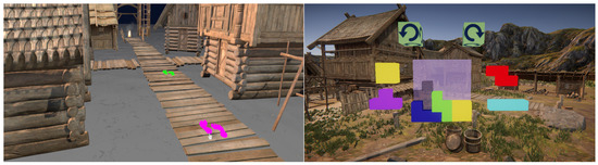 Illustration of SmartVR Pointer applications in a game-style scenario. On the (left), we show the navigation task within the Viking Village. Footprints are shown in bright green when they are available for selection, and turn purple indicating they will be used for teleporting there upon clicking. On the (right), we show the Tetris-style task. The Tetris shapes are shown in bright colors and the rotation regions are shown in green with black circles. The user drags and drops shapes to be placed in the appropriate location and orientation which is highlighted with the darker shade.