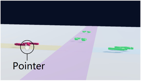 When the phone screen displaying the QR code is within the camera’s view, Vuforia is used to place a pointer on top of the center of the QR code. We can obtain the position of this pointer within the camera view (Figure 5 shows a red cube acting as a pointer). Additionally, there is a transparent 2D canvas object that covers the user’s field of view inside the VR environment and is fixed to a camera plane in front of the user. We call this the VR canvas. The position of the pointer in screen coordinates is converted to the corresponding local coordinates within the canvas. These coordinates are then used to display a pointer (similar to a desktop mouse pointer) on the canvas, which the user can see within the VR (Figure 6 and Figure 7).
