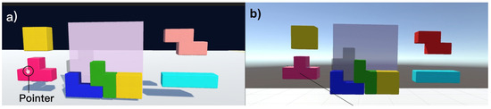 Illustration of how the ray-casting mechanism works. (a) The view the player sees while wearing the HMD shows a pointer highlighting the Tetris block in the bottom left for selection. (b) The developer view illustrates how a black ray is cast from the player towards the pointer, and through the Tetris block.