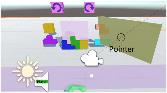To demonstrate the feasibility of SmartVR Pointer, we implemented two sample applications. The first of these applications is a navigation task, where the user navigates around the VR environment by selecting footprint-shaped teleport markers placed on the floor using a pointer that looks like a mouse pointer, which we call a virtual pointer or simply “VR pointer”. The user can teleport by aligning the VR pointer with the footprints and tapping the phone screen to jump to the desired location. The second application illustrates a key-and-lock mechanism inspired by the video game Tetris. Here, the user sees a sample Tetris-style scene, where there are blocks and one or more empty spaces where additional blocks can fit in between the existing blocks. The user must select the correct blocks and adjust their position and orientation so that they fit inside the provided empty spaces (Figure 1). Our user study results show that the proposed technique can be used to conveniently perform common tasks in VR, such as navigation, selecting, positioning, and determining the orientation of 3D objects.