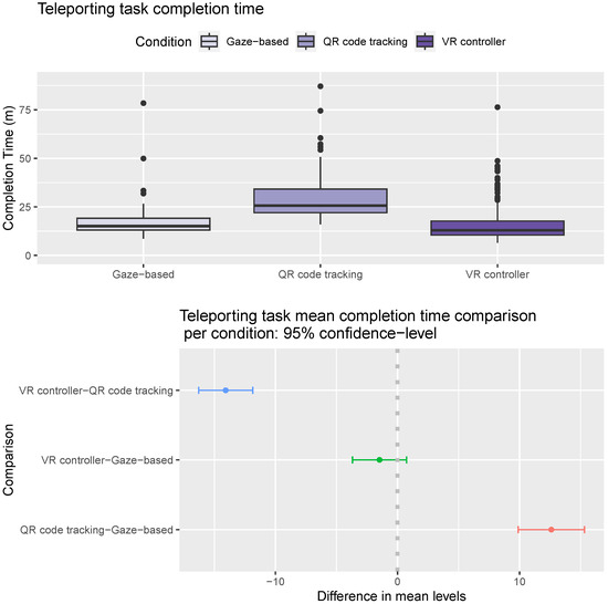 Results from an ANOVA analysis suggest that the most significant factors in the teleporting task completion time of the participants are the condition (F statistic 117.13, p-value < ) and the round (F statistic 18.82, p-value < ). Gender is a moderately significant factor (F statistic 7.58, p-value 0.006), and age is not a significant factor (F statistic 1.52, p-value 0.22). Male participants were slightly faster in this task than female participants (mean completion time 18.04 m vs. 19.89 m, Tukey multiple comparisons of means p-value 0.014). Users completed the teleporting task faster in later rounds suggesting a learning effect. As shown in Figure 9-Top, users using the gaze-based approach and VR controller had significantly lower completion times in the teleporting task than users using the QR code-tracking approach (Tukey multiple comparisons of means p-value < ). Users were slightly faster using the VR controller than the gaze-based approach (mean completion time 17.1 m vs. 15.63 m, Tukey multiple comparisons of means p-value 0.26, Figure 9-Bottom).