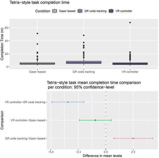 The ANOVA analysis results suggest that the most significant factors in the Tetris-like task completion time of the participants are again the condition (F statistic 17.84, p-value < ), and the round (F statistic 8.26, p-value ). Gender is also a significant factor (F statistic 15.20, p-value 0.0001), and age is a moderately significant factor (F statistic 4.51, p-value 0.012). Male participants were slightly faster in this task than female participants (mean completion time 5.73 m vs. 7.33 m, Tukey multiple comparisons of means p-value 0.001). Participants in the age range 24–48 were slightly slower in this task than participants in the age range 18–24 (mean completion time 6.91 m vs. 5.48 m, Tukey multiple comparisons of means p-value 0.012). As shown in Figure 10 (Top), users using the gaze-based approach and VR controller had significantly faster completion times in this task than users using the QR code-tracking approach (Tukey multiple comparisons of means p-values 0.003 and ). Users were slightly faster using the VR controller than the gaze-based approach (mean completion time 6.41 m vs. 5.46 m, Tukey multiple comparisons of means p-value 0.28, Figure 10-Bottom).