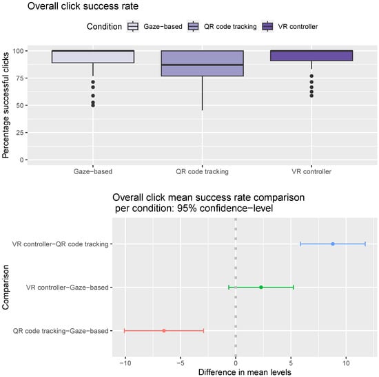 We calculated the click success rate of the participants as the percentage of successful clicks (successful clicks divided by total number of clicks). Based on the ANOVA results, the most significant factor in the click success rate of the participants is the condition (F statistic 24.72, p-value ). All other factors (gender, age, and round) were not statistically significant. Participants have a higher click success rate using the gaze-based approach and VR controller than when using the QR code-tracking approach (Tukey multiple comparisons of mean p-values 0.00007 and <, Figure 11).
