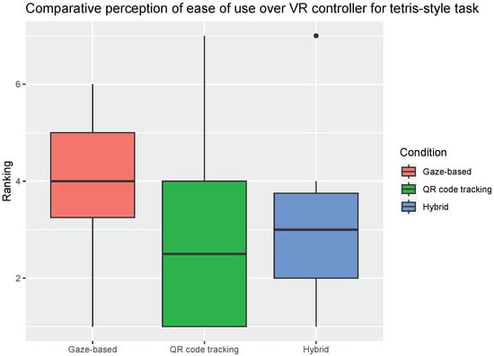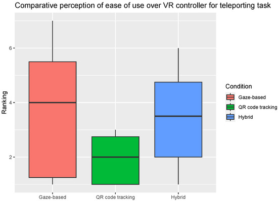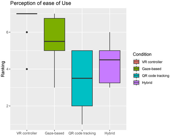 Participants perceived the VR controller to be easier to use than any of the other three conditions (Wilcoxon-adjusted p-values 0.001, , and for gaze-based, QR code-tracking and hybrid condition, respectively). Participants also perceived the gaze-based approach to be easier to use than the QR code-tracking and hybrid mode (Wilcoxon-adjusted p-values 0.009 and 0.047). There was no statistically significant difference in the users’ perception of ease of use between the QR code-tracking and hybrid condition (Figure 12).
