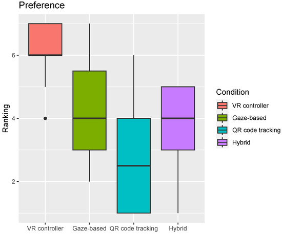 Participants reported preferring to use the VR controller to solve both tasks more than any of the other three conditions (Wilcoxon-adjusted p-values 0.003, , and for gaze-based, QR code-tracking and hybrid condition, respectively). Users also reported preferring to use the gaze-based condition over the QR code-tracking condition (Figure 13).