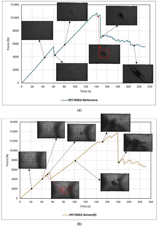 This section presents the visual inspection results, focusing on sensor activation and damage detection performance. For the scale, images of the back face cover the whole sample size (100 mm ×150 mm). As shown in Figure 9, damage on the back face remains imperceptible until just before fibre failure occurs at the second load drop, around forces of approximately 10,000 N. The initial point of visible damage is denoted by red colouring on the graph. This is where the structure has undergone significant damage and poses a very low residual structural integrity. However, across both two graphs associated with sensor samples, it is evident that the sensor on the back face activates before the first load drop at forces below 5000 N (highlighted by red colouring). This observation highlights the sensor’s ability to detect damages as subtle as matrix cracks, given that its activation precedes the initial load drop, thereby rendering it a viable early warning tool for BVID detection and avoiding delamination.