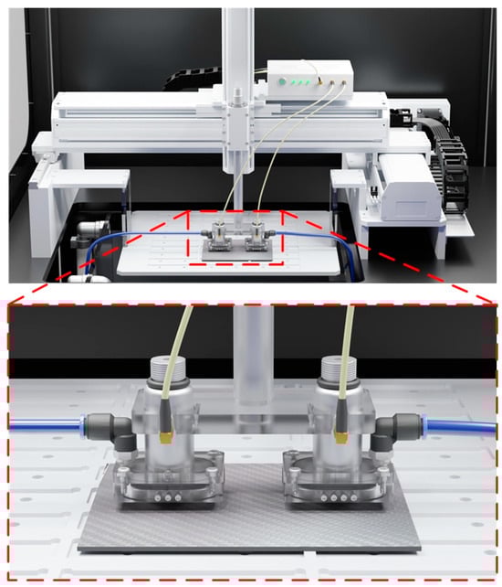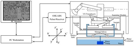 For industrial applications, many commercial SAM systems have been developed, such as those by KSI, Honda, Sonix, Nordson, and PVA TePla. Their systems have been used for product inspection in mass production. The automotive SAM system was proposed to enhance the system’s capabilities in in-line inspection. In this way, a robot arm is incorporated into the SAM system to transfer the sample, for instance, the SAM 300 system (PVA TePla). The wafer sample was transferred from the tray to the fixture. To implement the scanning process, the fixture was controlled to fully immerse the sample into the water. By integrating a robot arm and fixture into the SAM system, the entire system becomes complicated, thereby increasing time consumption.