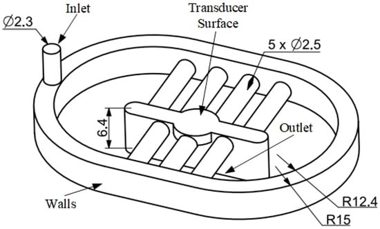 Figure 4 shows the modeling of the water domain. The inlet diameter was 2.3 mm corresponding to the hole diameter obtained through one-touch fitting. The distance between the transducer surface and outlet was set equal to wp. Water was flowed from the inlet to the outlet through the wall boundary that was modeled to cover the transducer outside diameter of 22.9 mm.