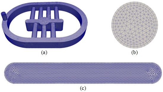 Before the simulation process, the water domain was created and mesh constructions were generated by using the open-source SALOME software version 9.7.0. Figure 5a shows the mesh construction of the water domain that contains 295,161 elements. The mesh constructions of the inlet and outlet are shown in Figure 5b and Figure 5c, respectively. The convergence and runtime depend on the element sizes, that were set with minimum and maximum values of 0.01 and 0.07 mm, respectively.
