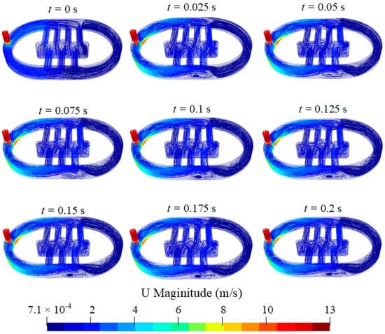 In this study, a waterstream is used to maintain the water environment between the transducer and sample during the scanning process. To investigate the flow characteristics, the instantaneous values of velocity and pressure in the water domain were determined and saved at each time step. Using OpenFOAM, these values were plotted at t = 250 × n × Δt, where n denotes integers from 0 to 8. Figure 6 shows the instantaneous velocity distribution inside the water domain, which is plotted as a streamline. At t = 0 s, water is injected from the inlet at the highest velocity. Owing to the high flow velocity, turbulence was generated inside the water domain. When the flow moved toward the outlet, the turbulence was dissipated because of the flow velocity decrease. From t = 0.1 s, the flow pattern was stable, thus forming a continuous flow that moved to the outlet.