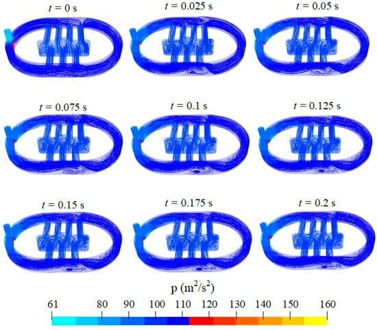 The pressure distribution inside the water domain is shown in Figure 7. According to Bernoulli’s principle, low-pressure regions were obtained at the areas that exhibited high flow velocity. In other words, low pressure appeared in turbulent areas. The flow velocity in the inlet throat was maintained at a high value for all the time steps, thereby generating low pressure in the inlet throat. Similar to the velocity distribution, a stable state of pressure was obtained from t = 0.1 s. An animation video of the velocity and pressure distributions was recorded for illustration (Supplementary Movie S1).