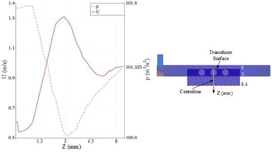 For further understanding the velocity and pressure behaviors inside the water domain, the velocity and pressure profiles along the centerline between the transducer surface and outlet are shown in Figure 8. The velocity was the highest at Z = 3 mm, near the middle orifice. The flow velocity decreased to 0.55 m/s when the water level reached to transducer surface. As expected, the pressure behavior plotted in contrast to the velocity profile; this indicates that the pressure increased when the velocity decreased and vice versa. At the outlet, the pressure was approximately equal to atmospheric pressure, whereas the flow was continuous at 1 m/s.