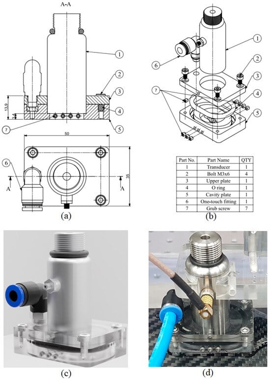 The waterstream is designed based on the modeling parameters, which cover the entire water domain. To simplify the design and fabrication processes, the concept of the waterstream includes seven components, as shown in Figure 9a,b. One-touch fitting was fixed on the upper plate by a thread joint, which defined the inlet of the water domain. The walls and outlet were created in the cavity plate. Figure 9a shows a two-dimensional (2D) drawing of the waterstream. The upper and cavity plates were connected by bolts. The waterstream was mounted on the transducer using a grub screw. Figure 9b shows an exploded view of a three-dimensional (3D) drawing of the waterstream. An O-ring was used between the upper and cavity plates to restrict water overflow. The grub screws were fixed on both sides of the cavity plate to curb the water leakage problem.