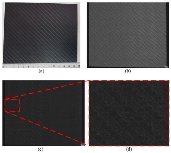 Figure 11b,c show the scanning images of the top surface and underlayer of the CRFP sample, respectively. These results indicate the good adhesive quality between the top surface and underlayer (no delamination), as shown in Figure 11c. In addition, the fiber orientation is illustrated in the underlayer image, as shown in Figure 11d.