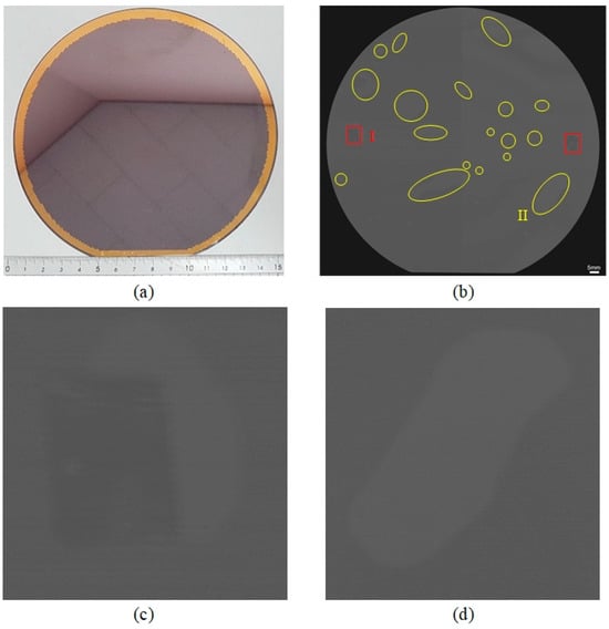 (a) The 6-inch wafer sample, (b) C-scan image of wafer, (c) enlarged view of I area, (d) enlarged view of II area.