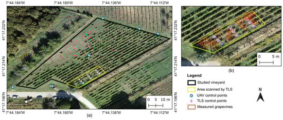 Overview of studied vineyard plot subjected to unmanned aerial vehicle data acquisition (a) and the area scanned by terrestrial laser scanner along with the studied grapevines (b).