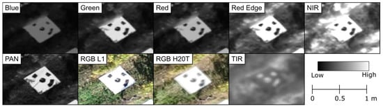 View of ground control points in the different imagery data types acquired by the sensors on the unmanned aerial vehicle. NIR: near-infrared; PAN: panchromatic; TIR: thermal infrared.