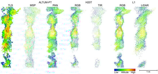 Regarding the average number of points within the grapevine canopies, the photogrammetric processing of the panchromatic data produced an average of 2451 points, L1 RGB data had 2220 points, and the L1 LiDAR data showed 1557 points. The RGB imagery from H20T produced an average of 1253 points, the multispectral imagery had 626 points, and the TIR imagery had an average of 328 points within the grapevine canopy. The point density from the TLS sensor was approximately one thousand times higher than that of the UAV sensors, with an average of 751,780 points. These differences are illustrated in Figure 5, which displays the point distribution and density of the grapevine canopy along part of a row.