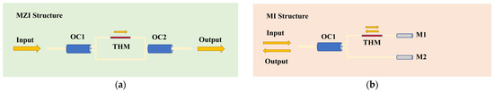 We choose the Michelson Interferometer (MI) over the Mach–Zehnder Interferometer (MZI) structure due to the differences in their experimental setups. As shown in Figure 3, when the optical signal enters the MZI structure, it is divided into two paths by the OC1 and then propagated through the two arms of the device. Up to this point, the propagation of the optical signal in both of the MZI and MI setups is the same. However, in the MZI, the two beams of light, after passing through the two arms of the device, are coupled and then output by OC2, whereas in the MI, the two beams of light are reflected by mirrors (M1 and M2) set behind the two arms and then return to the previous coupler to be output. This significantly extends the time that the optical signal acts within the two arms of the device, allowing for better utilization of the phase-shifting capabilities of the THM composite structure.