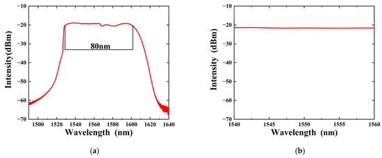 To more intuitively observe the phase shift caused by the thermo-optic effect, an ASE light source is used as a signal source in this experiment. The ASE light source can produce a very broad spectral range. Within a specific wavelength range, the spectral intensity distribution is flat and stable. Figure 4a presents the complete ASE light source spectrum ranging from 1490 nm to 1640 nm. It can be seen that the ASE spectrum has a relatively flat intensity distribution over an approximate 80 nm wavelength range from 1525 nm to 1600 nm. The spectral lines within the range of 1540 nm to 1560 nm can be approximated as a straight line with a smooth intensity variation according to Figure 4b. This stable spectral characteristic can exclude the impact of intensity fluctuations of the ASE light source signal itself on the intensity variation in the output interference spectrum, which is beneficial for the observation and analysis of the interference spectrum in subsequent measurements.