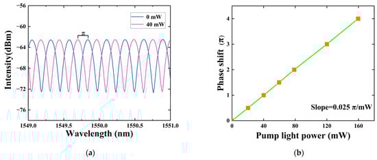 The red line represents the interference spectrum when the pump light power is 40 mW in Figure 5a. Compared to the interference spectrum at 0 mW, the waveform intensity in the output spectrum at this time changes from a peak (trough) to a trough (peak), which meets the condition in the interference principle where the intensity of the output optical signal changes from a maximum value (minimum value) to a minimum value (maximum value). At this point, the spectral phase shift can be estimated as π [15].