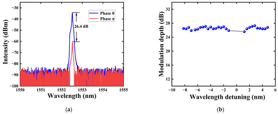 Then, the signal source can be replaced by the narrow-band light source (the ECL, which is mentioned in Section 2) in order to study the modulation depth of the all-optical modulator. The central wavelength of the filter at the output port is consistent with the wavelength of the signal light, which is used to filter out interference such as pump light. The pump light power is set to 0 and 40 mW, respectively, and the interference spectrum intensity output at phases of 0 and π is tested. Figure 6a shows the output interference spectrum intensity when the pump light power is 0 and 40 mW, respectively, from which it can be concluded that the modulation depth of the modulator at this time is 26.4 dB.